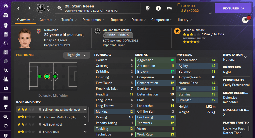 After scrambling for a new defensive midfielder for most of the transfer window, I took a stab at Stabæk youngster Stian Røren on a season-long loan. This no-nonsense Norwegian is brave and energetic, but I’ve also heard that he’s more aggressive than Vinnie Jones with a chainsaw… or Stefan Lindmark, for that matter.