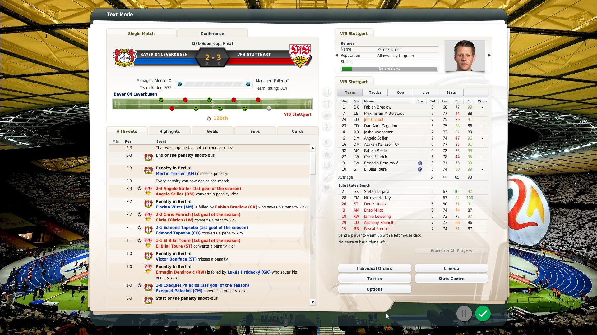 The commentators also don’t mention any players or clubs by their correct names – which is no surprise, given most of today’s stars were still in school when these commentary lines were recorded. I did, though, hear Tyldesley once refer to my centre-forward Deniz Undav as ‘Ibrahimovic’. He also called my team ‘Manchester United’ more than once during a Bundesliga match.