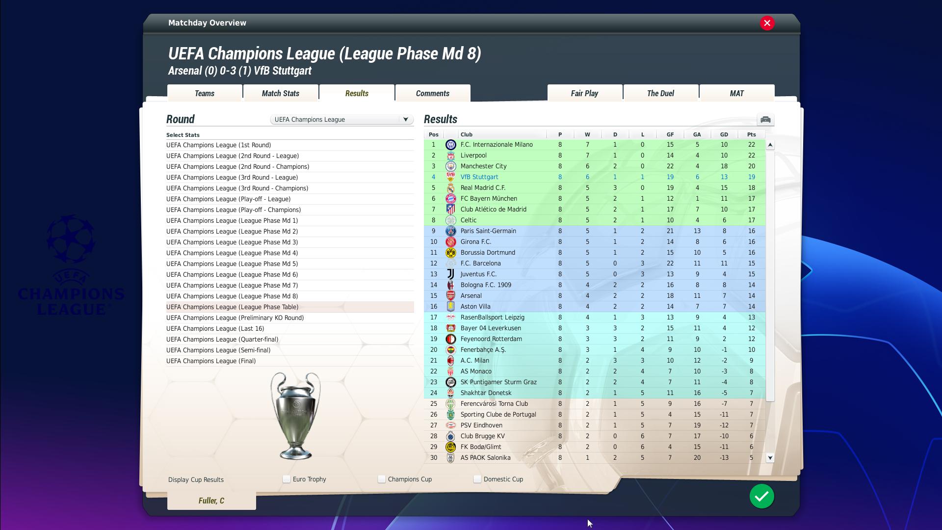 There are loads of complicated rules that dictate how the league phase matches are organised (e.g. seeding pots, even numbers of home/away matches, can’t play a team from your nation). Football Manager does this quite well already, with a few caveats… but as far as I can tell, FIFAM 25 gets it pretty much spot-on. It shows just how much effort and attention these modders have put into their work that they’ve got this format working like clockwork on a game that’s now over a decade old.