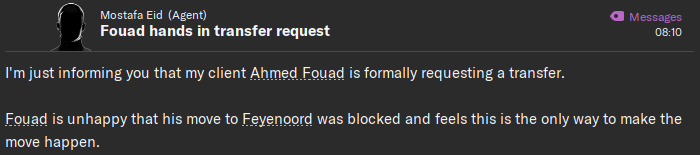 His compatriot Ahmed Fouad, meanwhile, has been kicking up a stink. After losing Mutambe in January, I really didn’t want to lose Fouad as well, so I rejected several offers from the Eredivisie’s top clubs. As you can probably guess, Ahmed wasn’t too chuffed.