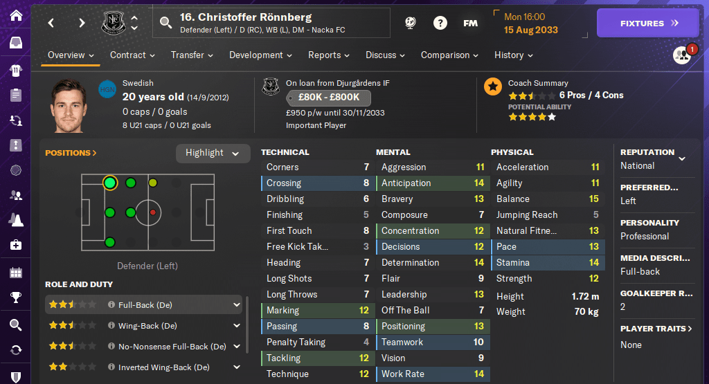 I reinforced our non-existent backline with two summer signings. We needed another left-back to give Emílio Chamboco some proper competition, so I brought in Sweden Under-21s international Christoffer Rönnberg on loan from Djurgården. Chris is quick, hard-working and defensively strong – just don’t ask him how to cross.