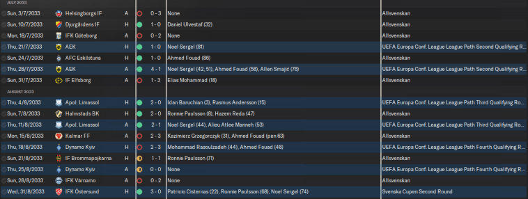 On 21 July 2033, an incredible 6,844 fans turned up at the Zinkensdamms stadium in Södermalm to watch our very first UEFA match. Despite losing our vice-captain César Gamarra to a serious knee injury, we absolutely battered AEK… but their young fresh-faced goalkeeper (age 29) had the game of his life and saved practically everything.
