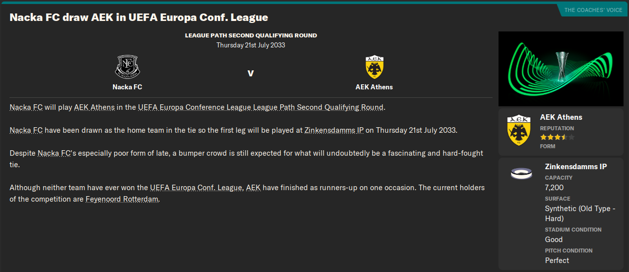 After an inconsistent start to the 2033 Allsvenskan season, Nacka are now preparing for their first ever matches in the Conference League. Can we survive the qualifiers and get through to the League Phase – with all the money, prestige and Ally McCoist waxing lyrical about us on Thursday evenings that will bring?