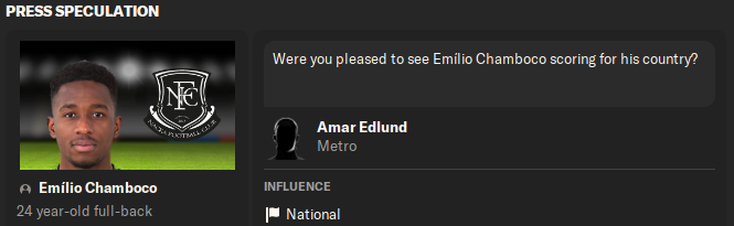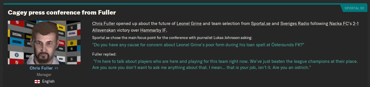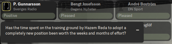 The best thing I can say about press conferences on FM is that they’re an easy way to manage your players’ body language before a match, whether that’s by building up their confidence or reducing pressure. You might prefer to leave that to someone else, but I for one don’t want to risk my assistant manager saying something stupid like, “Yes, I would like to sell our top scorer to IFK Göteborg for peanuts!”