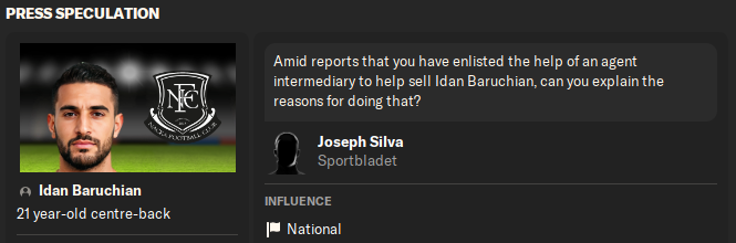 A similar thing happens when you try to sell a player through an intermediary. Every single time you hit the “Hire An Intermediary To Sell Player” button, even if there are NO intermediaries willing to help you find a buyer, you’ll get a new message in your inbox: “This is Pers Morgensson from the Swedish Daily Mail. I hear you’re selling a player through an intermediary now. Please tell me more.”