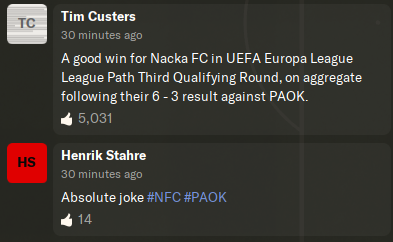To make a real-life comparison, Malmö FF – who are Sweden’s biggest and most successful club – have around 98,000 followers on Twitter. (And to be fair, 97,000 of those are probably porn bots.)