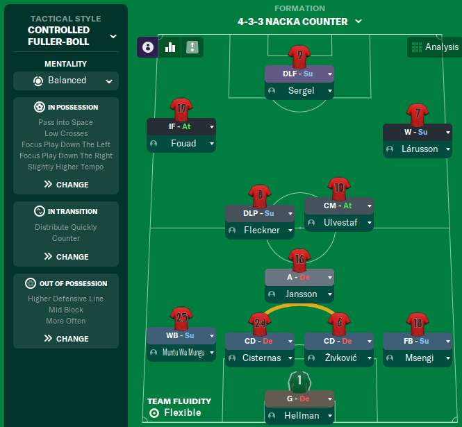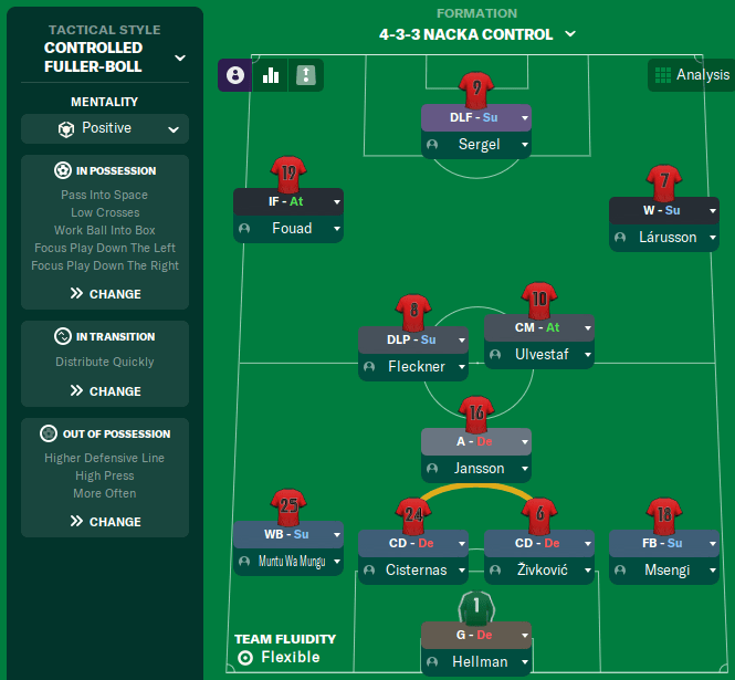 After a dozen years, my Nacka 4-3-3 is nearing its final form. I now has a system which is defensively fine, provides plenty of support from midfield, and also a good amount of attacking penetration. The only question marks in terms of positions are in the DM slot (I might change the Anchor to a slightly more fluid Defensive Midfielder on Defend) and up front (I’m often switching the Deep Lying Forward between Support and Attack duties).