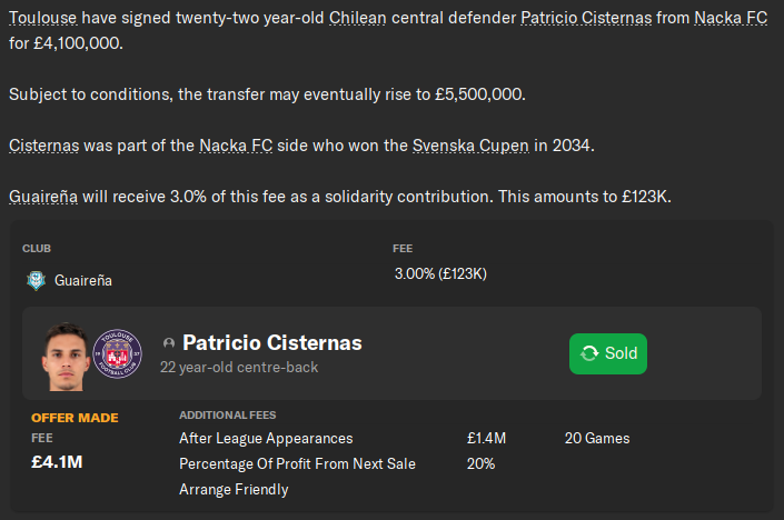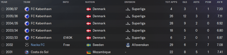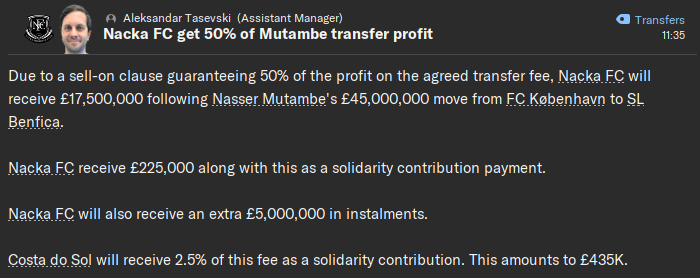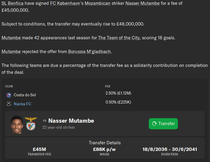 I’m sure regular readers will remember Nasser Mutambe – the Mozambican wonderkid who lit up Nacka in our first Allsvenskan season in 2032, and then headed off to FC København. We only received £140,000 at the time, but we also snuck in a 50% sell-on clause in the hope that we could profit from a future big-money transfer.