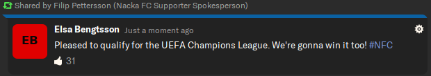 But we can’t dwell on what might have been. Having finished 3rd last season, we had now achieved something even greater. Champions League football was coming to Nacka.