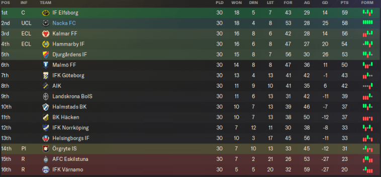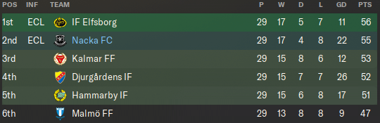 Were both us and Elfsborg to lose, 3rd-placed Kalmar would still have a shot at glory – providing they won their remaining fixture. Although 4th-placed Djurgården had no chance of retaining their title anymore, they remained in Champions League contention. Hammarby were also hoping to sneak into the European places.