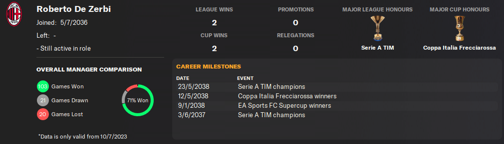 On my save, Roberto De Zerbi basically did a Pioli, but better. He was at Inter for six years, even winning a Serie A title in 2026. After six years away from the San Siro, he returned to take charge of AC Milan – and won two more scudetti with them.