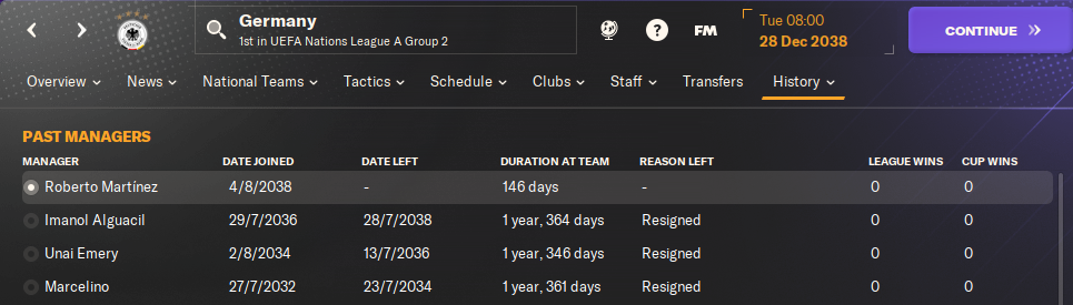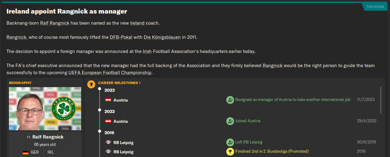 I’ve also seen international managers move BETWEEN nations for no logical reason. A very common occurrence early into a typical FM24 save is that Ralf Rangnick will quit a mediocre Austria national team to manage an even more mediocre national team (e.g. the Republic of Ireland or Poland).