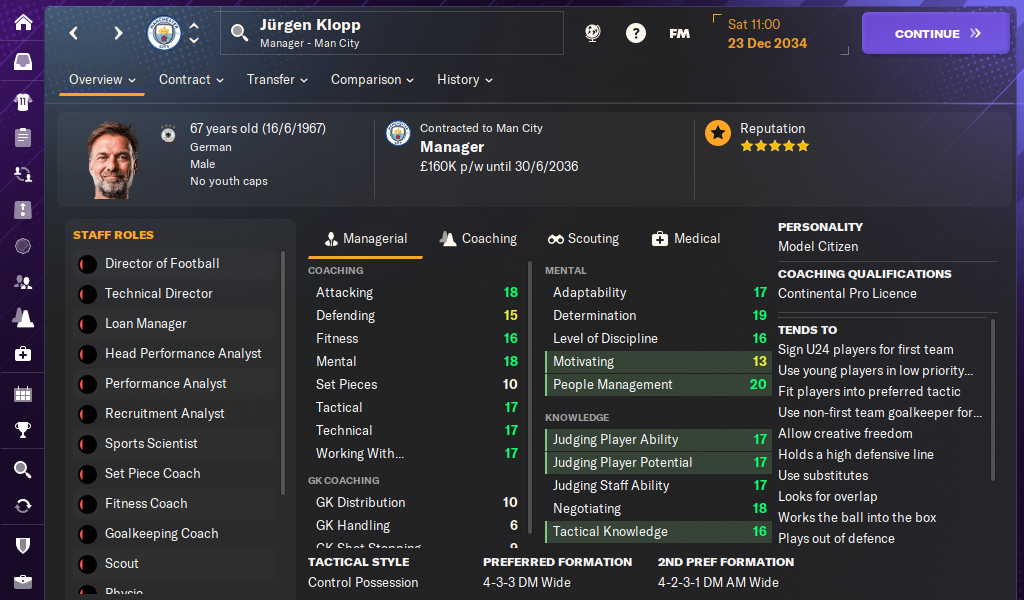 Cursed Klopp felt so dirty about wearing sky blue in this universe that he got himself sacked 16 months later and ended his career as a scout… at Newcastle. By the way, Klopp also managed Bayern Munich in this save.