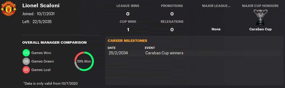 Scaloni fared much better after moving to Tottenham in 2037, winning the treble in his first season. Admittedly, that was an underwhelming ‘treble’ of the Community Shield, UEFA Super Cup and League Cup… and he was sacked after six months, with Spurs floundering in the bottom half.
