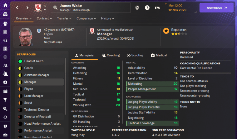 James Wake randomly spawned into my save with elite coaching attributes and an empty CV. Some time later, he got his first ever role in professional football – earning 35 grand per week as manager of Championship high-flyers Middlesbrough.