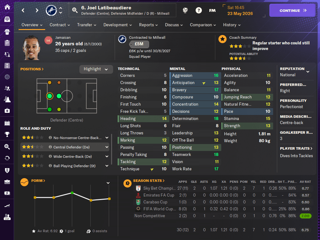 I had this on my previous save at Millwall, where I signed Joel Latibeaudiere as centre-back, but he wanted to be a ball-winning defensive midfielder. And here’s the thing – he would consistently make mistakes and get low ratings as a DM, but he would kick up a fuss whenever he had to play in defence, where he actually did much better. What gives?