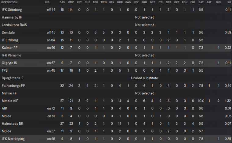Goran Matijasevic has scored 6 goals in 16 appearances for Nacka, which isn’t bad for a teenager playing his first season at the club. But an FM content creator might ignore the number in brackets and instead say that Goran has netted “6 goals in 5 starts”.