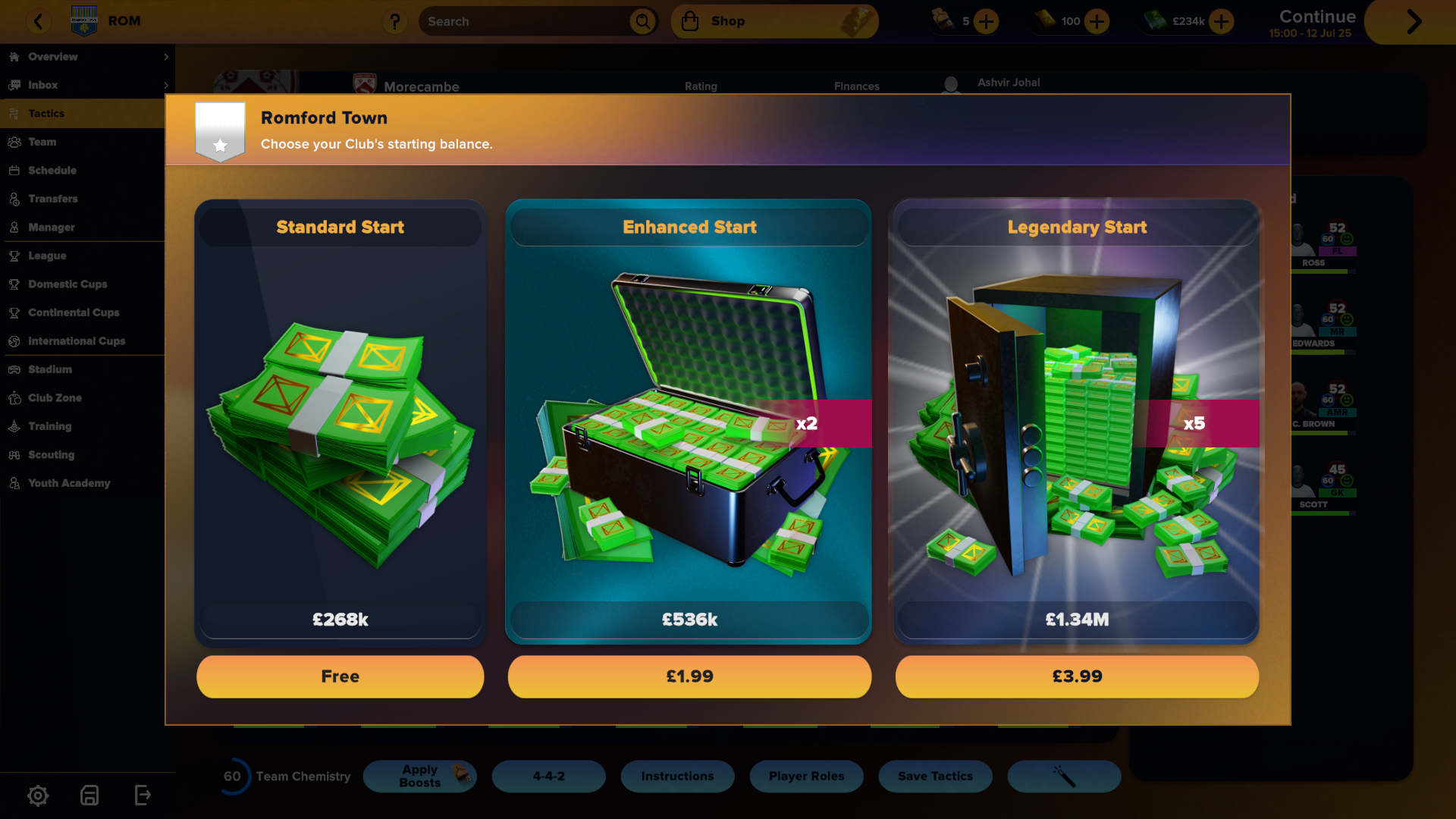 But, of course, because this is a freemium game, you will get those annoying pop-ups asking if you want to spend real-life money on in-game currency. The first pop-up I got after creating my custom club was asking me to select a starting budget. I could keep my wallet closed and start with a shoestring budget… or I could spend £4 to give myself an extra million quid.