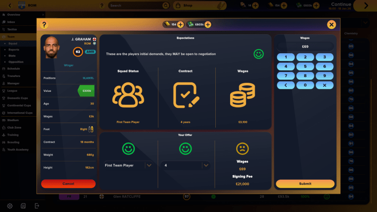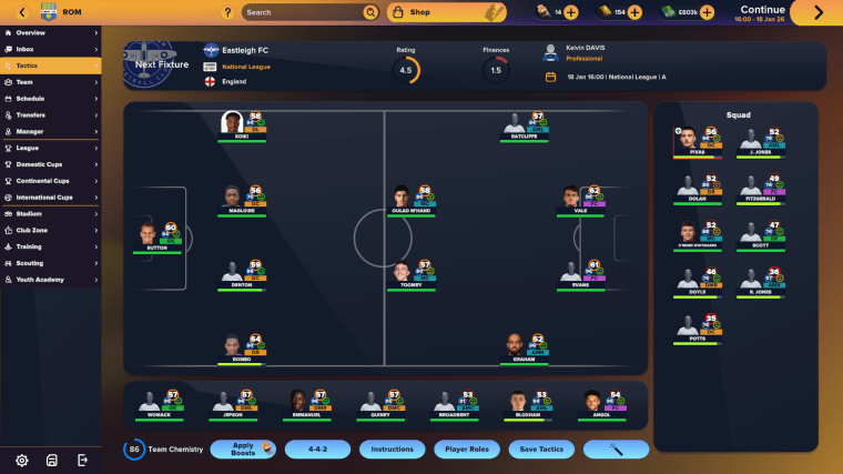 SM26 is also more generous with its in-game currency, which means you can improve your manager’s skills faster without needing to spend as much real-life money. Boosts can be used to heal your players’ injuries and improve their morale, and Gold can help you sign players while the transfer window is closed. That was particularly useful when my team was struggling for goals, and I found that Lee Angol was available.