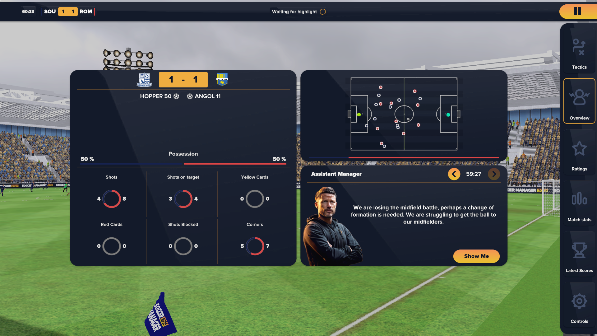 The assistant manager’s ‘advice’ is practically useless. The AI-generated Jason Tindall lookalike could be telling you that your attackers are outplaying the opposition defence, even if you’ve registered one single shot on target in the first 30 minutes.
