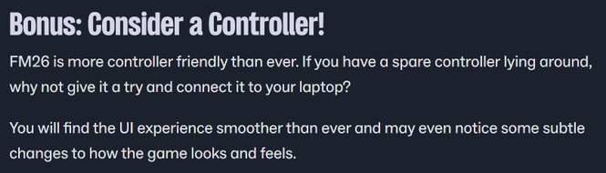 Then again, BAF highly recommends using a controller rather than a keyboard when playing the game. I know that, because it keeps reminding me every time I boot up the game! I’ll just say that this suggestion really sticks in my craw now that I’ve experienced Football Manager 26.